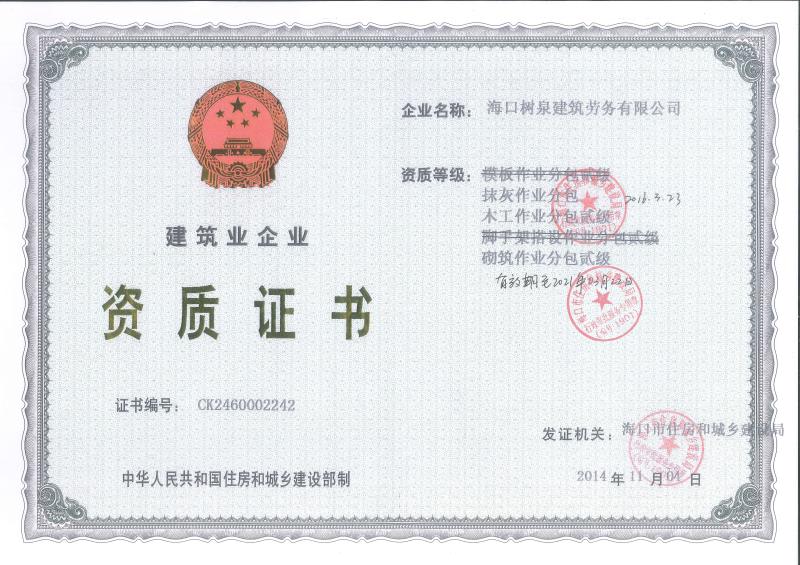 海口樹泉建筑勞務(wù)有限公司成立于2011年,公司位于海口,其前身是一家專業(yè)建筑施工隊,自2004年即開始在海南從事建筑勞務(wù)施工。自成立至今,公司已經(jīng)擁有一支科學(xué)管理、質(zhì)量過硬、能打硬仗,搶工期的專業(yè)隊伍。能獨立承擔(dān)大中型工業(yè)與民用建筑 、室內(nèi)外裝修、各類機(jī)電設(shè)備安裝工程。代表工程有海口濱海華庭、三亞時代海岸T01/02/04/05棟高層、合肥東海花園二期、陵水富力灣B區(qū)高層、三亞金中海(酒店)、瓊海大印經(jīng)典花園、海口環(huán)球海景大酒店(四星級酒店,在建中)、陵水珍珠大廈(五星酒店)、海口萬達(dá)廣場、美蘭機(jī)場二期。
